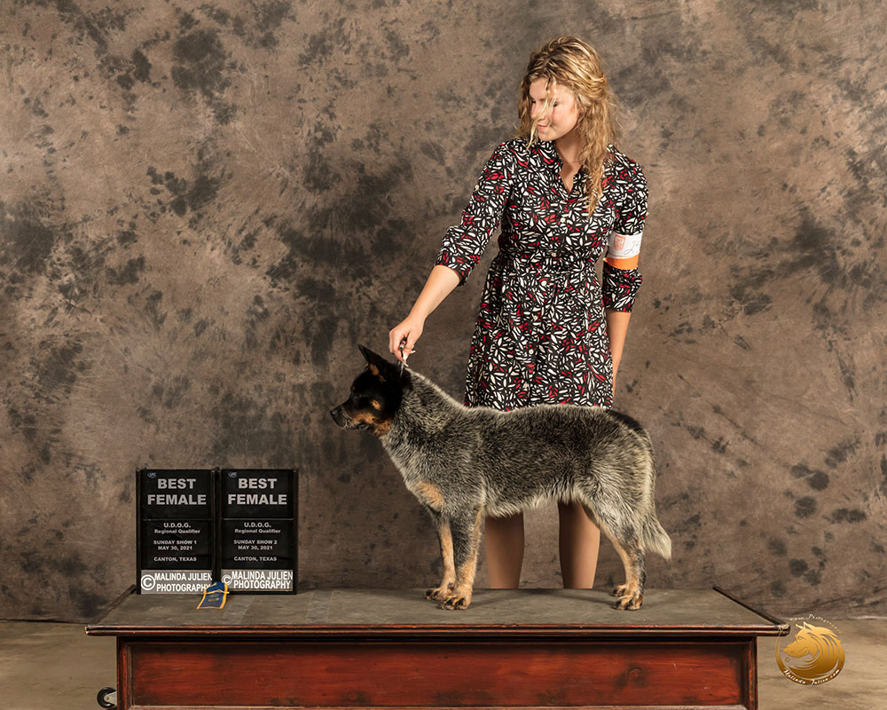 "Queen" Comes from a notable line of Australian Cattle Dogs that combines the strength of the the great CH Revolver Di Monte Tonico and the great Buzzard line. Queen is a fun girl who loves people and loves to go places. An excellent example of the classic Australian Cattle Dog, she is witty, fun and has great drive. Queen has had a great show career with AKC, UKC and International. She is an International Champion and an AKC Champion of record.