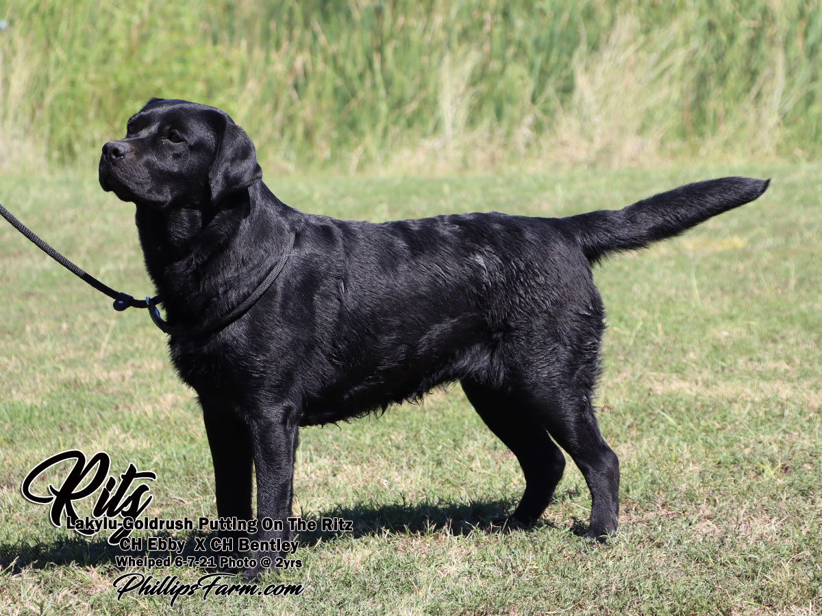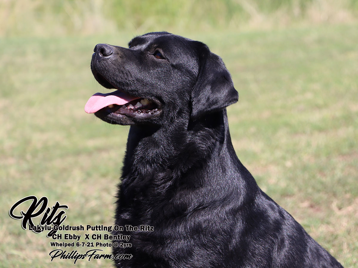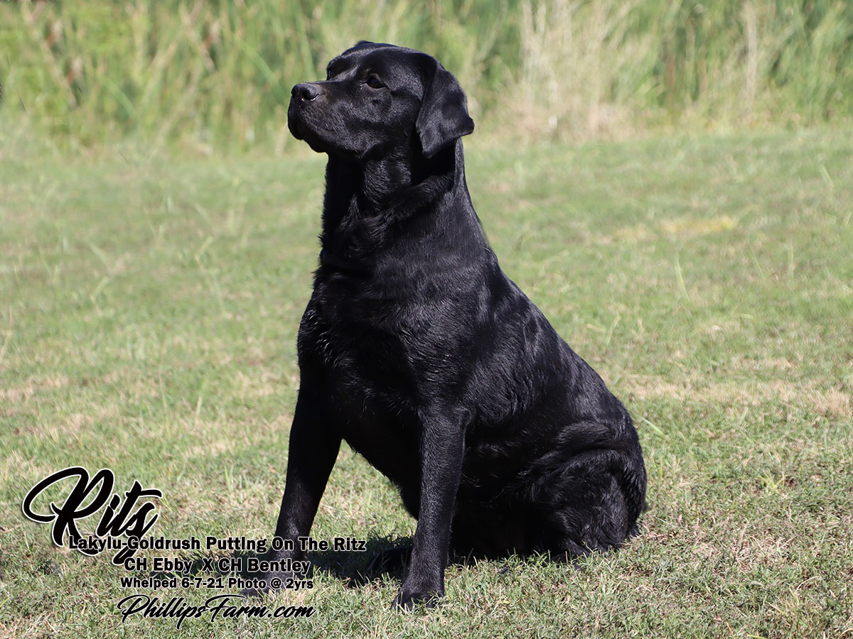 Ritz's pedigree combines an impressive line up of AKC Champions. She is an outstanding individual with beautiful conformation, a stunning head and thick otter tail. She is a sweet a biddable girl with nice drive when working.